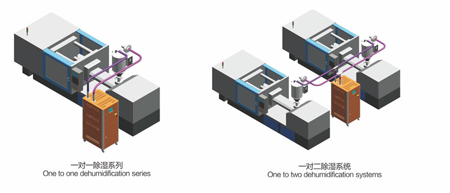 ● 一臺(tái)除濕機(jī)可以搭配數(shù)個(gè)獨(dú)立干燥料斗使用。